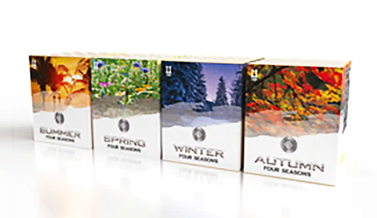 Available in four varieties sold separately: Spring – Green tail to brocade horsetail, silver strobe mine with goldfish, gold strobe mine with silverfish, green tail to brocade horsetail. Summer – Purple tail to yellow fish with purple core, yellowtail to yellow strobe waterfall, purple tail to purple strobe waterfall, purple tail to yellow fish with purple core Autumn – Red and Green Falling Leaves, Red Mine to Green Comet, Green Mine to Red Comet, Red and Green Falling Leaves Winter – Blue Tail to White Tail Strobe, Silver Tiger Tail with Silver Mine, Blue Tiger Tail with Blue Mine. Each last around 20 seconds and has a safety distance of 8m.
