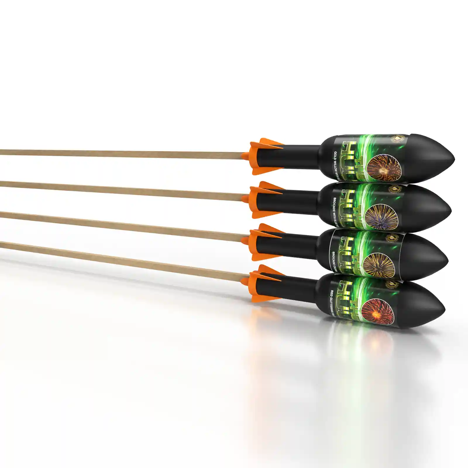 Hulk Smash! The Hulk Rocket is an absolutely stunning rocket with awesome aerial effects. Providing professional big and brash sky filling explosions. Each 6oz rocket shatters into stunning gold willow with blue stars. To brocade crown glitter and brocade crown with blue pistils. Finally dazzling red glittering willow light up the sky. Phenomenal 1.3g effects.