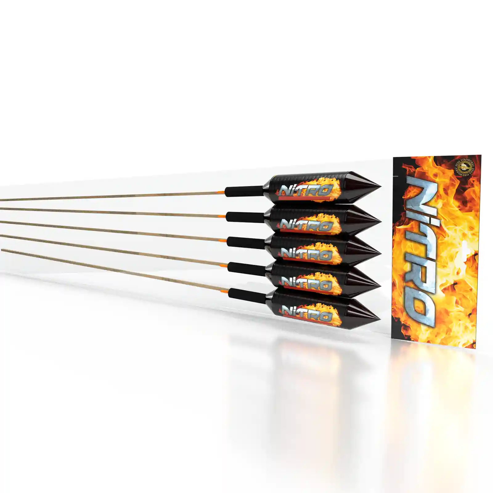 The Nitro Pack is a tremendous set of 1.3g effect rockets. They fill the sky with breaks at over 150 feet. With stunning effects from traditional brocade to brocade crown with blue stars. Also includes brocade crown with red blink, brocade crown with crackling and brocade crown with a green core. A wow factor!